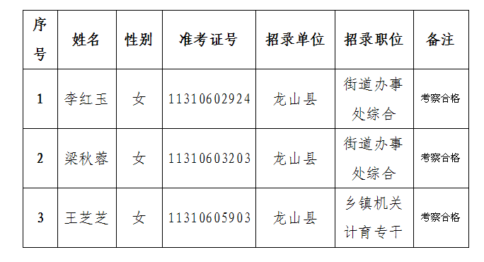 根据《湖南省2017年考试录用公务员公告》和有关规定,报考龙山县街道办事处综合考生李红玉、梁秋蓉和报考龙山县乡镇机关计育专干考生王芝芝因怀孕延后体检,现已完成体检和考察工作环节,将其作为拟录用人员予以公示,公示期7天(2018年2月7日-2月13日),如有疑问,请于公示期内与州人社局公务员管理局联系(联系电话:0743-8222916)。