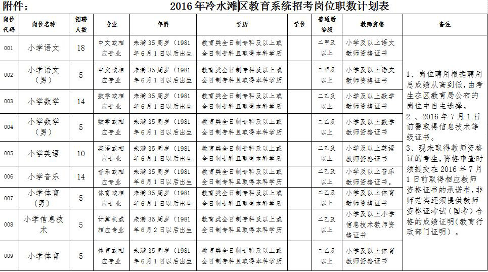 2.中学教师学历要求为全日制本科及以上;小学教师学历要求为教育类全日制专科及以上学历或全日制专科且取得本科学历,村小教学点教师学历要求为全日制大专及以上,年龄未满35周岁(1981年6月1日以后出生);幼儿教师须取得幼儿教育专业中专及以上学历,年龄未满28周岁(1988年6月1日以后出生)。岗位要求见《2016年冷水滩区教育系统招考岗位职数计划表》。