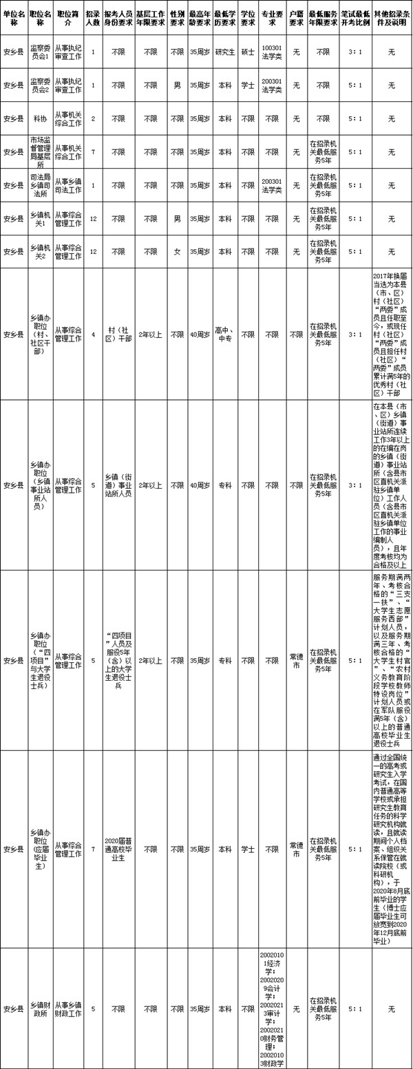6月22日,湖南省公务员局发布组织实施湖南省2020年考试录用公务员工作公告,全省共计划招考公务员7110名。安乡县今年招录公务员62名(含参公管理工作人员),其中有8个不限专业的岗位共招聘54名。