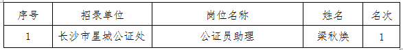 长沙市司法局所属公证处2018年公开招聘工作人员,经报名、笔试、资格审查、考核、体检、考察等程序,按照《招聘简章》相关规定拟录取以下1人,现公示如下,公示期为7个工作日。