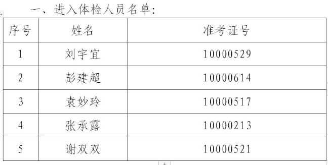 长沙市天心区桂花坪街道办事处招聘编外合同制工作人员,经报名、资格初审、笔试、面试等程序,根据考试综合成绩从高分到低分依次排名,按1:1的比例确定以下5人进入体检,现将进入体检人员名单及体检相关事项通知如下: