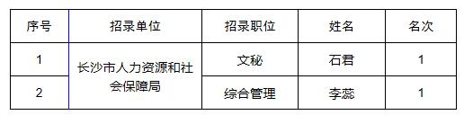 长沙市人力资源和社会保障局2019年度公开招聘中级雇员,经网上报名、笔试、网上资格审查、考核、体检、考察等程序,按照《2019年长沙市人力资源和社会保障局公开招聘中级雇员简章》相关规定拟录取以下2人,现公示如下,公示期为7个工作日。