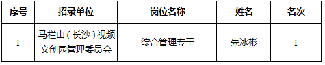 马栏山(长沙)视频文创园管理委员会2019年公开招聘(选调)工作人员,经报名、笔试、资格审查、考核、体检、考察等程序,按照《招聘简章》相关规定拟录取以下1人(第二批),现公示如下,公示期为7个工作日。