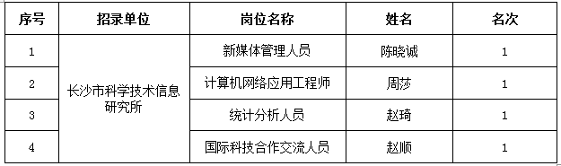 2019年长沙市科技局所属事业单位公开招聘工作人员,经报名、笔试、资格审查、面试、体检、考察等程序,按照《2019年长沙市科技局所属事业单位公开招聘工作人员简章》等相关规定,拟录取以下四人,现予以公示如下,公示期为七个工作日。公示期满无异议后,按程序办理相关人事手续。