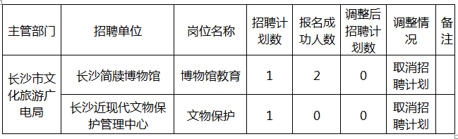 2019年长沙市文化旅游广电局所属事业单位公开招聘工作人员于2020年4月23日-4月29日进行了网络报名, 因部分岗位无人报名或报名人数达不到开考比例,根据《招聘简章》的相关规定,取消相应招聘计划数,具体情况如下:
