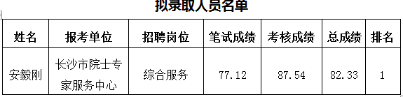 2019年长沙市科学技术协会所属事业单位公开招聘经报名、笔试、资格审查、考核、体检、考察等程序,按照《2019年长沙市科学技术协会所属事业单位公开招聘工作人员简章》相关规定,拟录取以下1人,现予以公示。如对公示人选有异议,请及时反映。公示时间为七个工作日,公示期满无异议,将按程序办理相关人事手续。