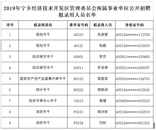 2019年宁乡经济技术开发区管理委员会所属事业单位公开招聘工作人员,经报名、资格初审、笔试、资格复审、面试、体检、考察等程序,按照《招聘简章》相关规定拟录取以下9人,现公示如下,公示期为7个工作日。
