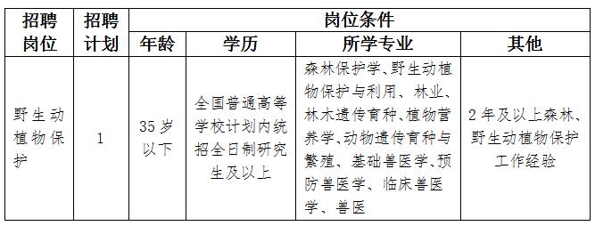 根据《2019年长沙市林业局所属事业单位公开招聘工作人员简章》,长沙市林业局对本次招聘的7个岗位进行了网上资格初审。截至1月17日,野生动植物保护岗位报名人数仍较少,由于该岗位是紧缺急需的岗位,经研究决定,将野生动植物保护岗位要求进行变更,变更后的招聘条件如下: