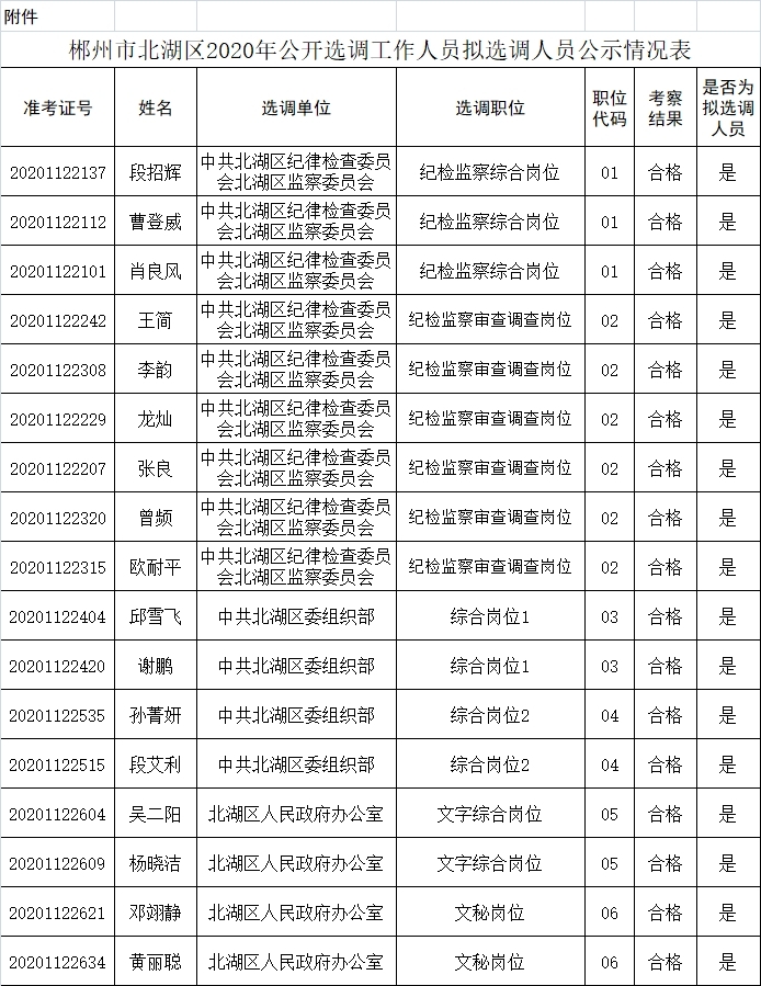 郴州市北湖区2020年公开选调工作人员考察工作已完成,根据《郴州市北湖区2020年公开选调工作人员公告》要求,现将考察结果和拟选调人员进行公示(公示情况表见附件),公示期为7天。公示期内,如有异议,请以书面形式实名反映并提供相关线索或证据。