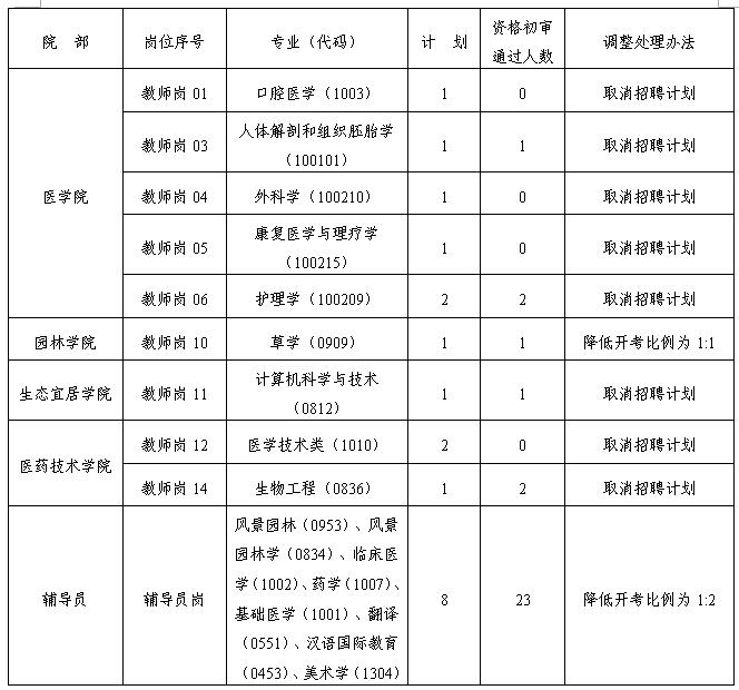 《湖南环境生物职业技术学院2018年公开招聘公告》于2018年5月11日在湖南省人力资源社会保障厅网站公开发布。根据招聘公告要求,我院对应聘者提交的报名材料进行了资格初审。因部分岗位无人报名或达不到开考比例,经学院公开招聘工作领导小组集体研究决定,报主管部门和省人力资源社会保障厅同意,作如下处理: