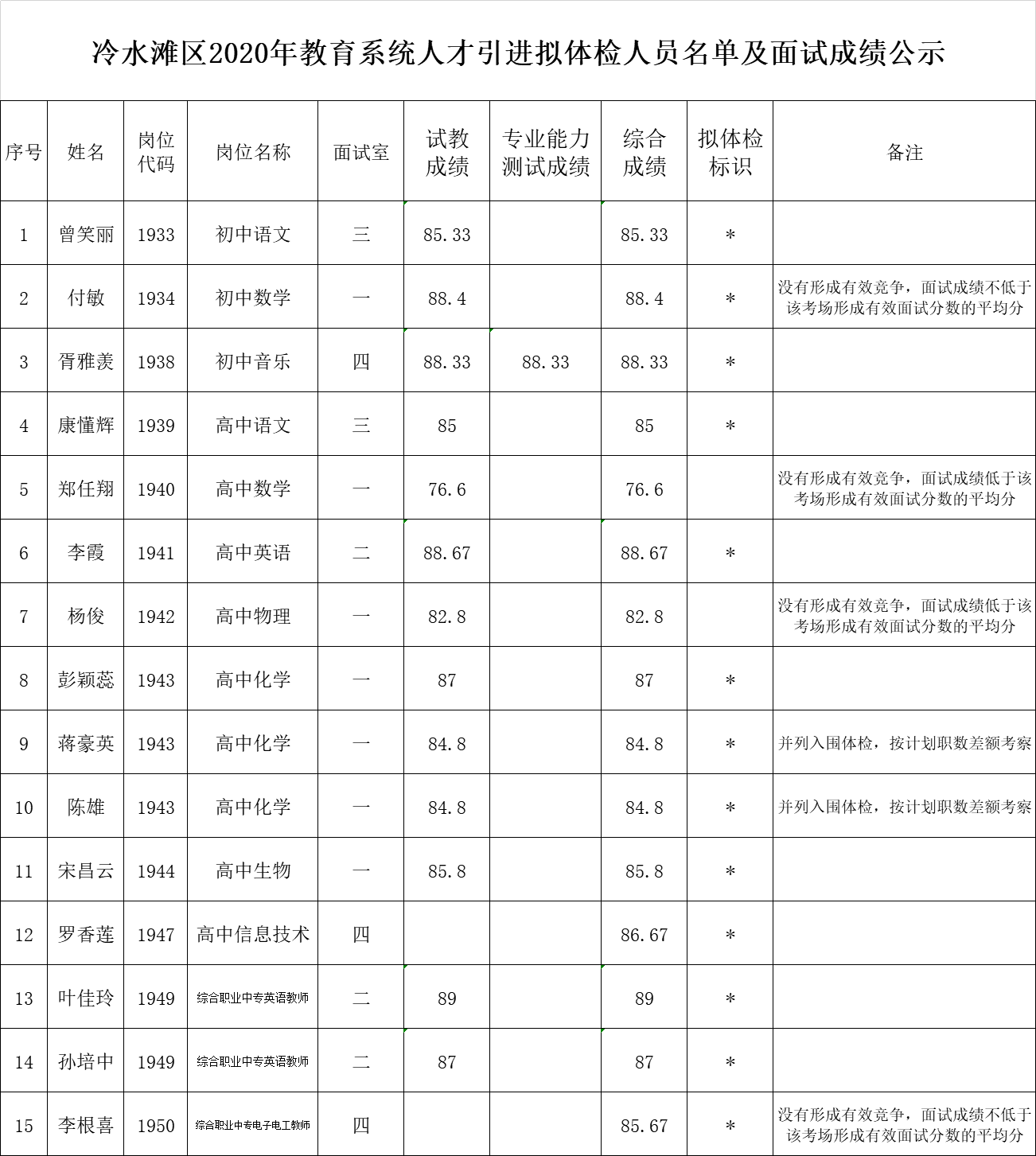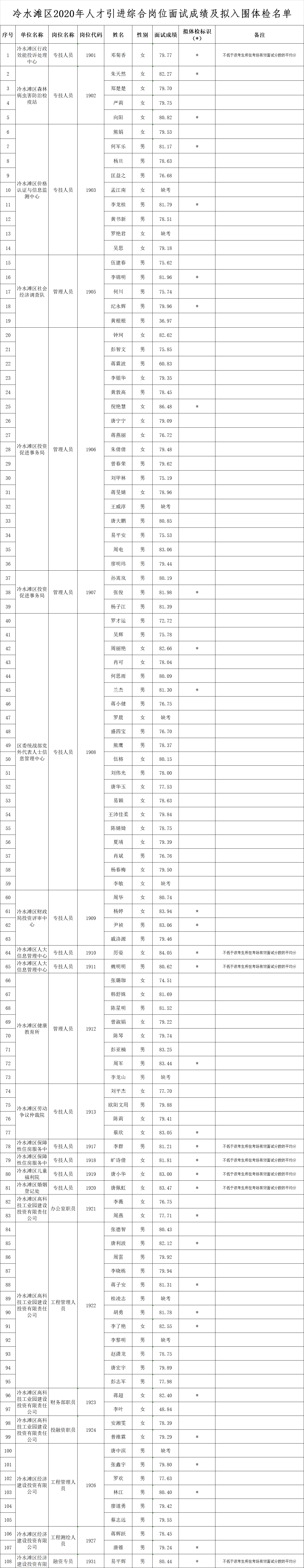 冷水滩区2020年综合岗位、教育岗位人才引进面试(试教)工作已经束。现将综合岗位、教育岗位人才引进面试成绩及拟入围体检名单公示如下: