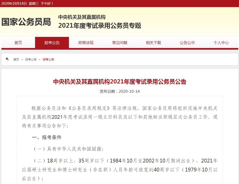 2021年国家公务员考试于10月14日公布招考公告,中央机关及其直属机构2021年度公务员招考报名即将开始,本次招考共有79个部门、23个直属机构参加,计划招录2.57万人。
