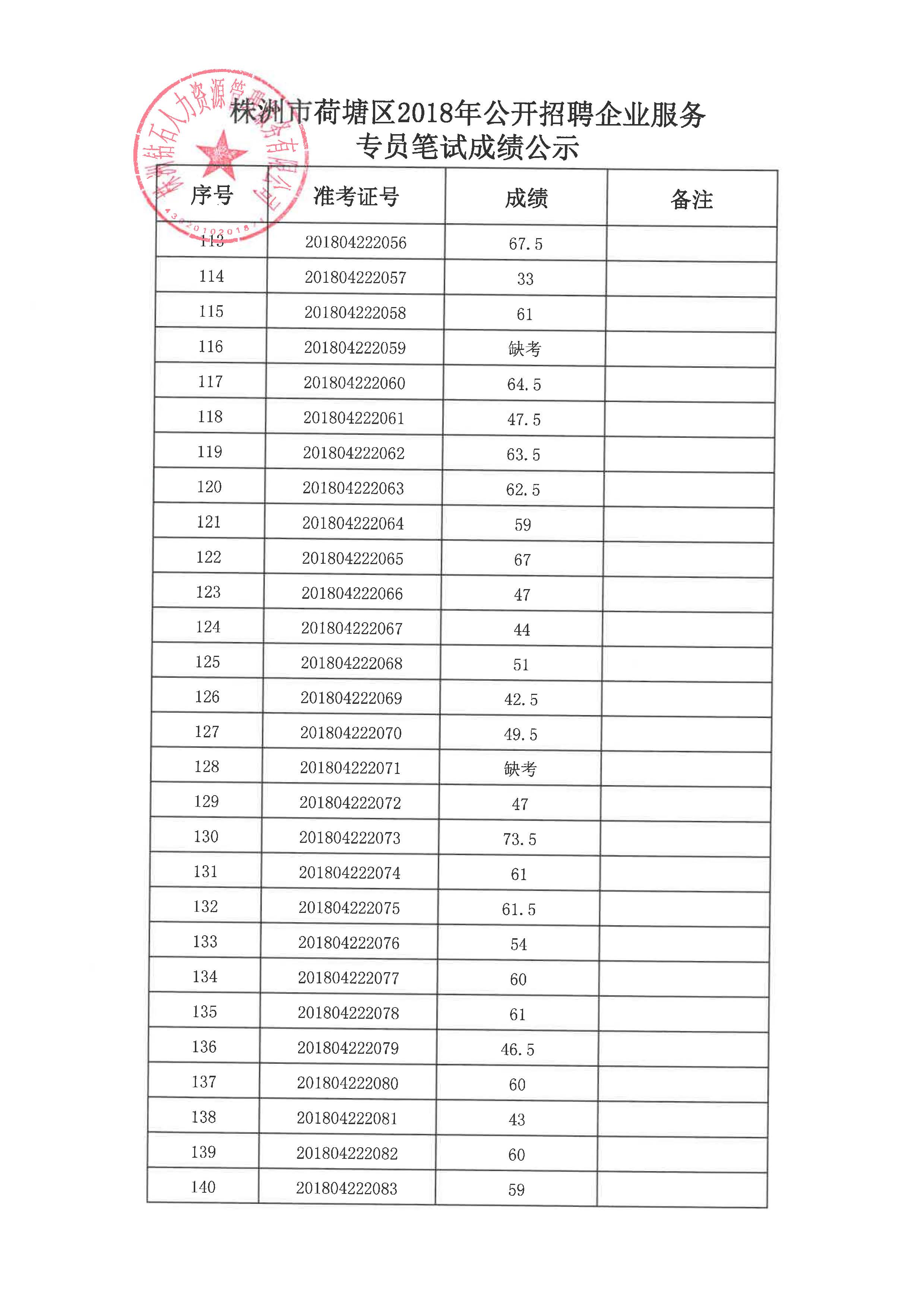 根据《2018年荷塘区企业服务专员招聘公告》(2018年4月12日发布),经公开报名、资格审核、笔试,株洲钻石人力资源管理服务有限公司于4月28日组织入围的考生进行了面试,现将面试成绩、综合成绩、体检入围名单予以公示。